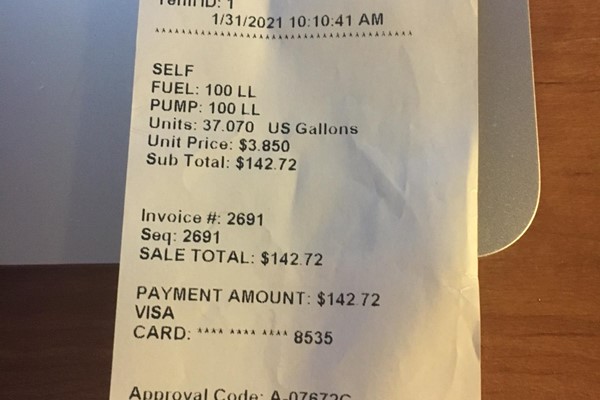 View Image01_31_2021_fuel_receipt.JPG - Flight By: Iain Clark on 1/31/2021 - Total Time: 3.2 - N92353 CESSNA 182N (182N)